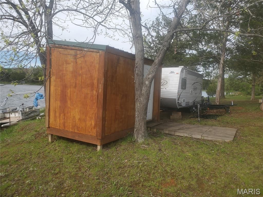 Waterfront lot in a gated community positioned perfectly for incredible unobstructed sunsets. This lot is right on the water and includes a 2014 Jayco Jayflight Swift 185 camping trailer, a combo storage shed/outdoor kitchen with mini fridge and cookstove. Enjoy the serenity of this quiet lot while enjoying a meal or beverage out on the deck at the water's edge. You're just a short walk to the beach with a couple of pavilions and a dock out in the water. Check out the website for more information and restrictions here - https://cedarlakemo.com/Pontoon is not included in sale but can be negotiated as personal property. Some photos are dated. Camper has been power washed.